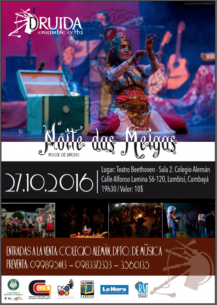 El Colegio Alemán Quito invita cordialmente al próximo Evento Cultural de la temporada 2016-2017: Concierto del Grupo DRUIDA: “Noche de Brujas” Jueves, 27 de octubre de 2016 – 19h30 – Teatro “Beethoven” Sala 2 del CAQ Samhain es la festividad de origen celta más importante del periodo pagano en Europa hasta su conversión al cristianismo, […]