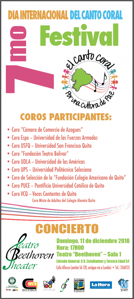 El Colegio Alemán Quito invita cordialmente a un evento cultural: 7mo Festival de Coros EL CANTO CORAL POR UNA CULTURA DE PAZ: Domingo, 11.12.2016